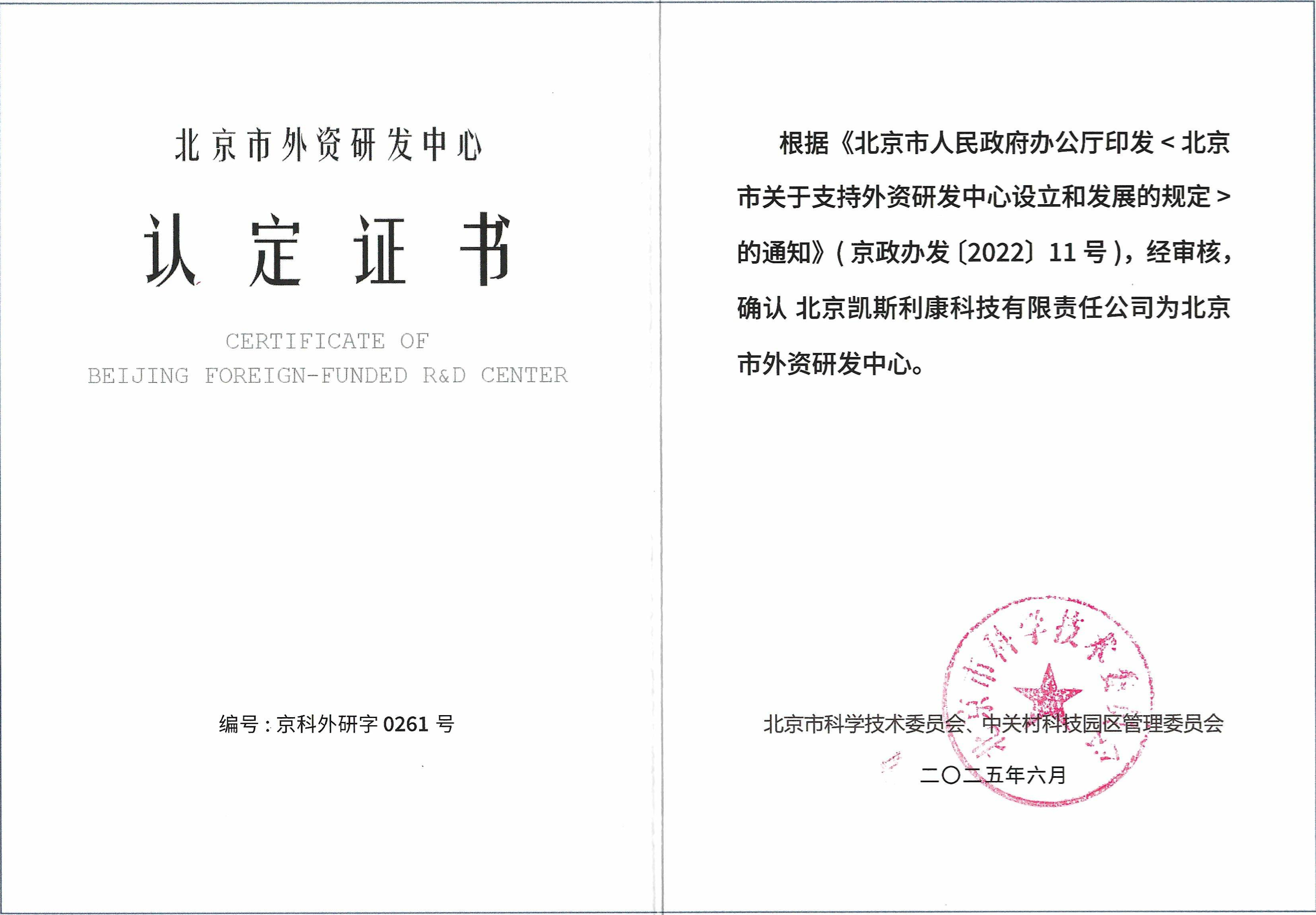 “北京市外资研发中心”认定证书